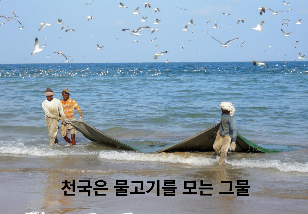 <마 13:47-49> "또 천국은 마치 바다에 치고 각종  물고기를 모는 그물과 같으니 그물에 가득하매 물가로 끌어내고 앉아서 좋은 것은  그릇에 담고 못된 것은 내어리느니라  세상 끝에도 이러하리라 천사들이 와서 의인 중에서 악인을 갈라 내어 풀무불에 던져 으리니 거기서 울며 이를 갊이 있으리라"